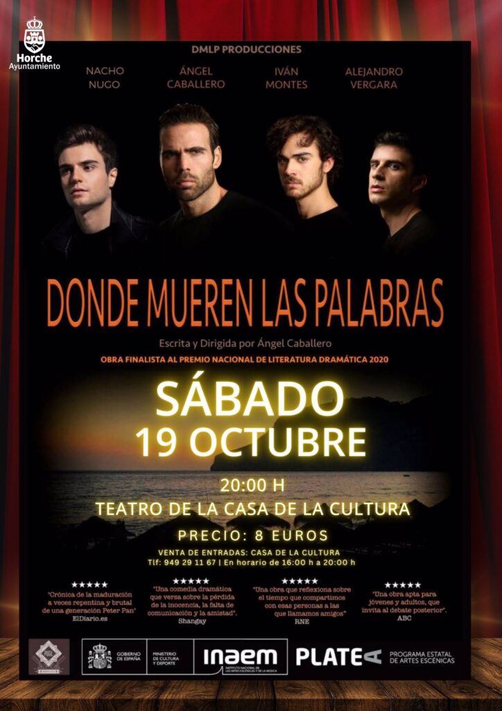 Después de su estreno en el Teatro Lara de Madrid, donde permaneció en cartelera durante cuatro temporadas, y de su éxito en Latinoamérica (considerada como una de las 10 mejores obras de 2021), la comedia dramática ‘Donde mueren las palabras’, obra finalista al Premio Nacional de Literatura Dramática 2020, ha vuelto con un nuevo montaje estrenado dentro del marco del 40 Festival de teatro de Málaga, y ha recorrido ya algunas de las principales ciudades de la geografía española como Valladolid, Almería o Melilla, entre otras, según ha informado el Ayuntamiento de Horche en nota de prensa.