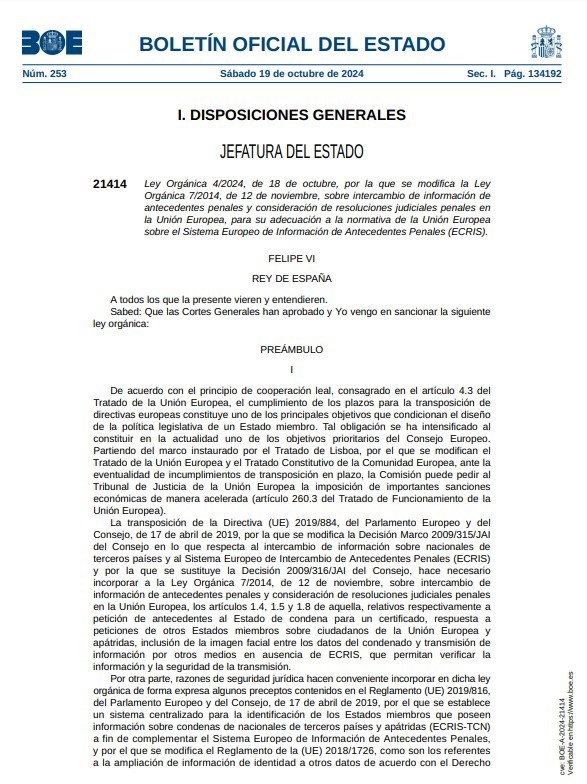 Se trata, en concreto, de la Ley Orgánica 7/2014, de 12 de noviembre, sobre intercambio de información de antecedentes penales y consideración de resoluciones judiciales penales en la Unión Europea, para su adecuación a la normativa de la Unión Europea sobre el Sistema Europeo de Información de Antecedentes Penales (ECIS).
