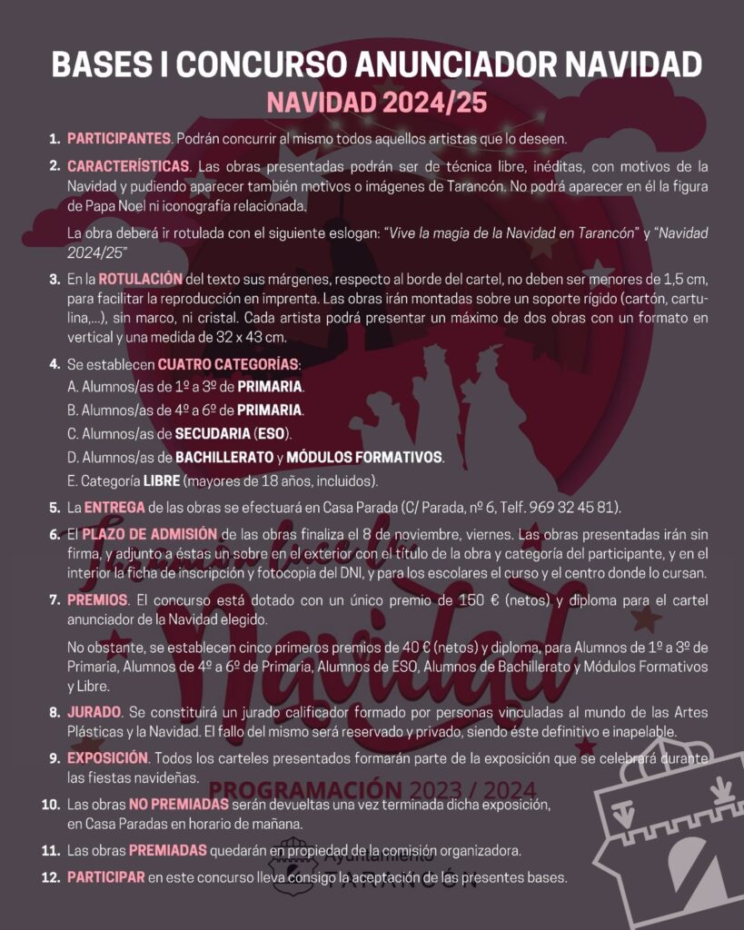 Las concejalías de Festejos y Cultura del Ayuntamiento de Tarancón han convocado el I Concurso Cartel Anunciador de Navidad, al que podrán concurrir obrs inéditas que pueden presentarse hasta el próximo 8 de noviembre en el Museo de Casa Parada.