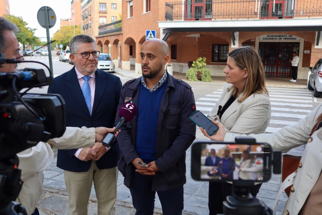El portavoz del Partido Popular en el Ayuntamiento de Azuqueca de Henares, Mane Corral, acompañado de la secretaria general del PP-CLM, Carolina Agudo, y por el diputado regional, Nacho Redondo.