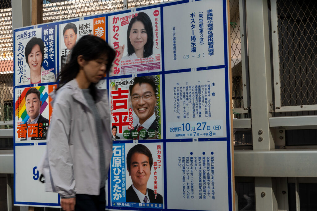 Una mujer en la capital de Japón, Tokio, frente a carteles electorales de las elecciones parlamentarias del 27 de octubre.
