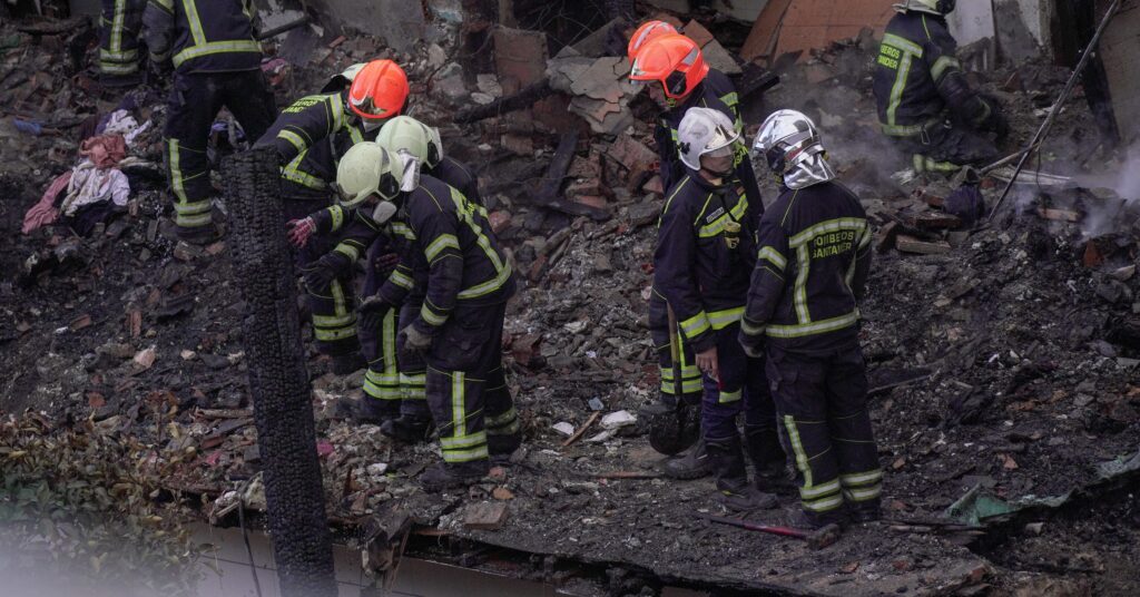Agentes del equipo de bomberos trabajando en el edificio derrumbado