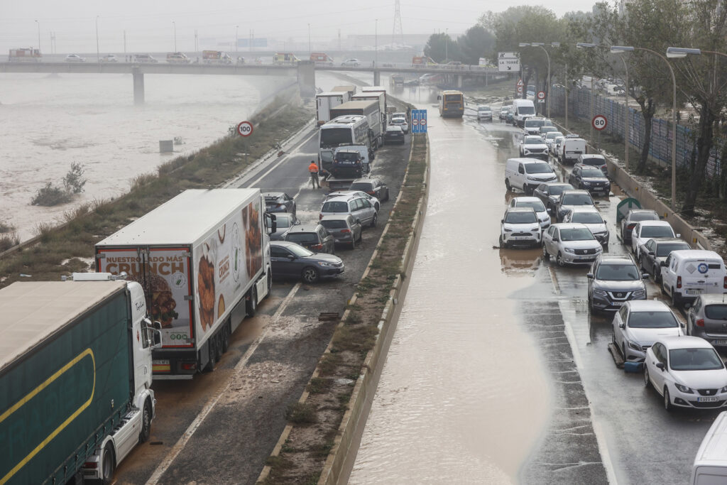 Vehículos en la V-30 tras el paso de la DANA y la subida del cauce del río Turia, a 30 de octubre de 2024
