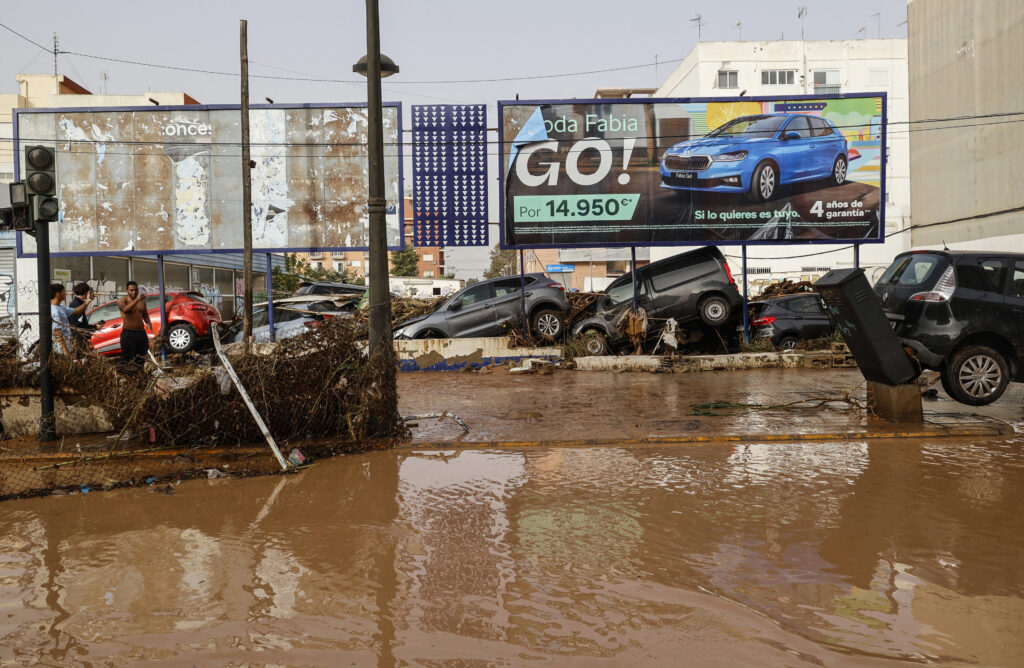 Vehículos destrozados tras el paso de la DANA por el barrio de La Torre, en València.