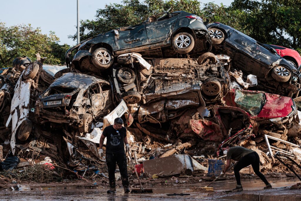 Varias personas limpian entre coches amontonados en Alfafar, a 5 de noviembre de 2024, en Valencia, Comunidad Valenciana (España).