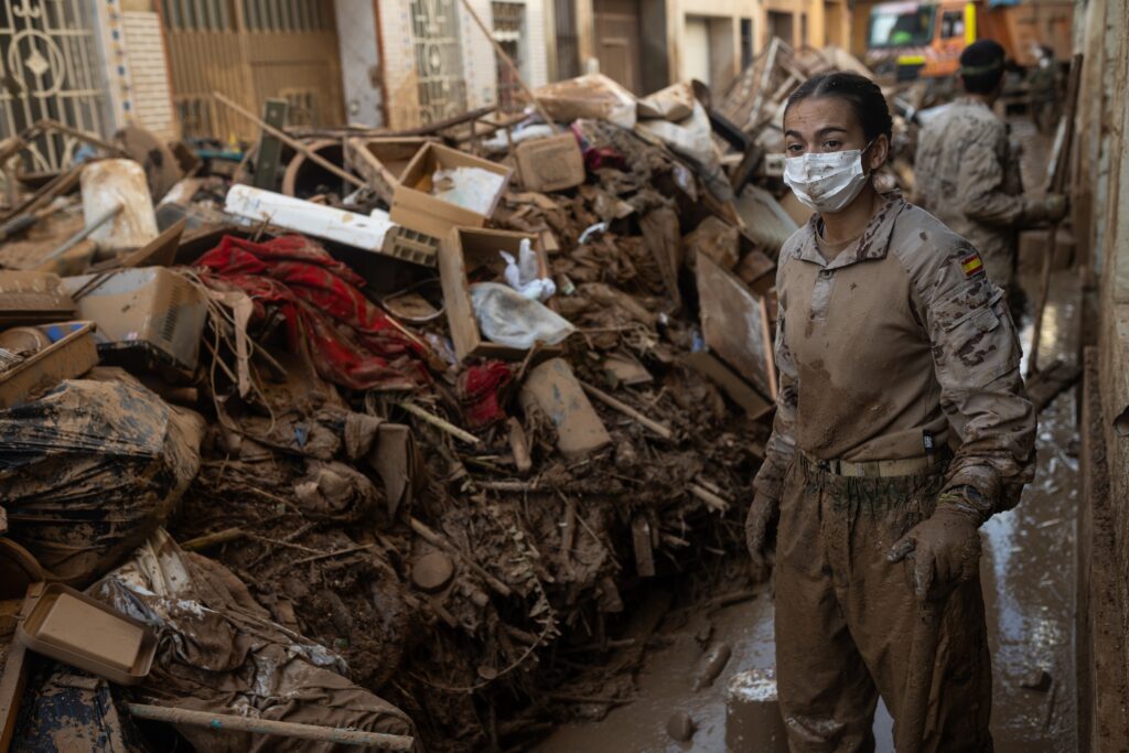 Una militar en la limpieza de una de las zonas afectadas por la DANA, a 8 de noviembre de 2024, en Paiporta, Valencia