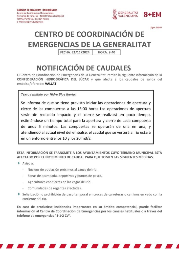 Según recoge el Centro de Coordinación de Emergencias (CCE), se ha remitido la información de la CHJ que afecta a los caudales de salida del embalse de Vallat a los ayuntamientos de la zona.