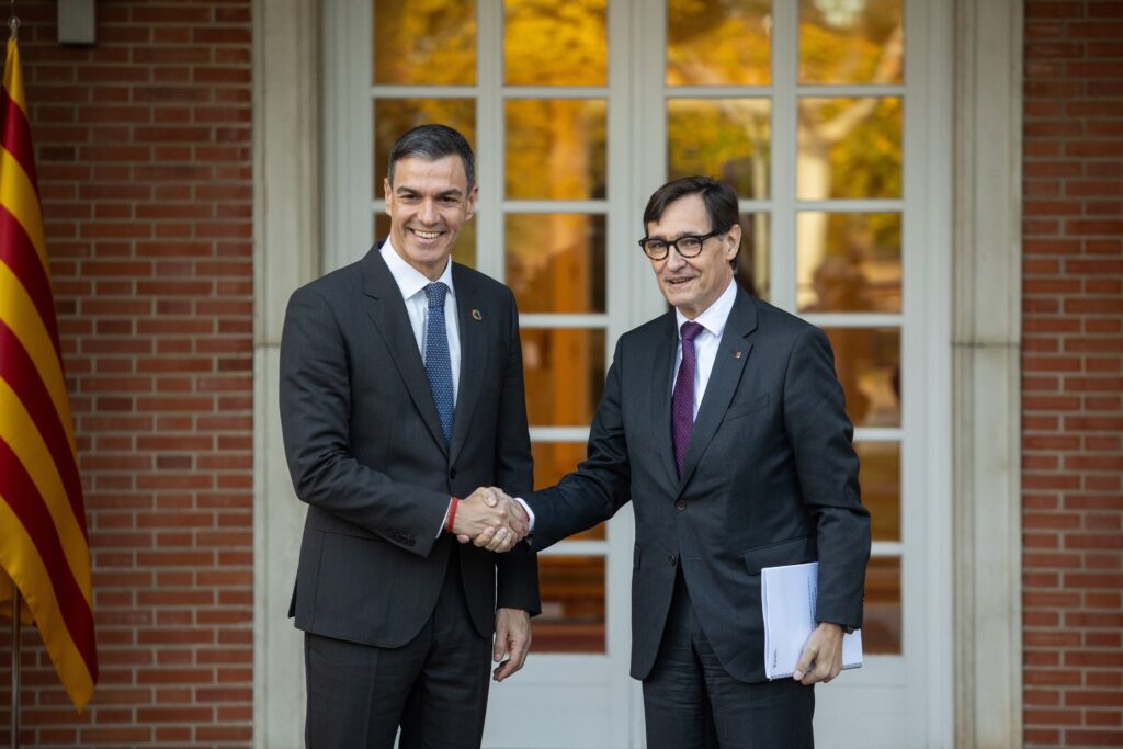 El presidente del Gobierno, Pedro Sánchez (i), se reúne con el presidente de la Generalitat de Catalunya, Salvador Illa (d), en el Palacio de La Moncloa, a 22 de noviembre de 2024, en Madrid (España). Sánchez cierra hoy su ronda de encuentros bilateral
