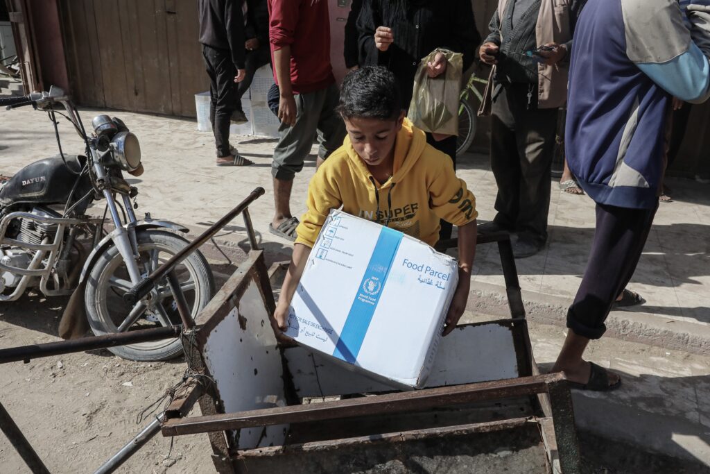 Un niño palestino transporta una caja con ayuda humanitaria del Programa Mundial de Alimentos en la Franja de Gaza