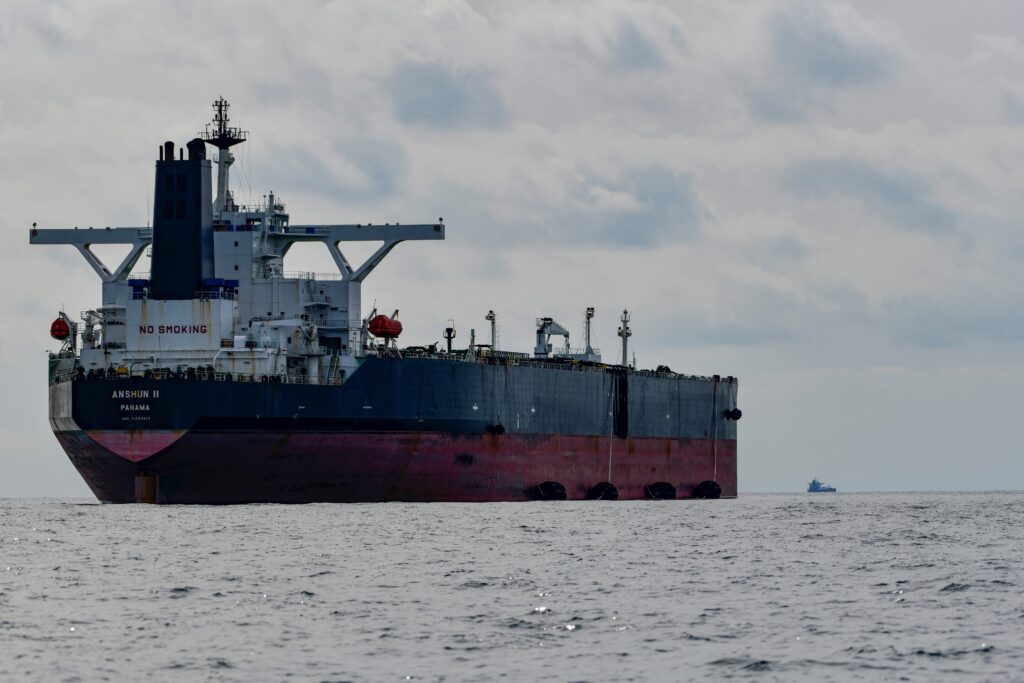 Archivo – El buque ANSHUN II con las defensas “Yokohama” preparadas y las tuberías conectadas para recibir otro petrolero y trasvasar crudo ruso, a 20 millas de Ceuta (España).