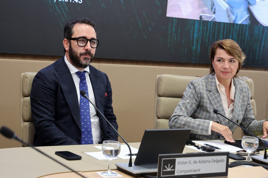 Archivo – El presidente del Zamaro CF, Víctor de Aldama, sentado junto a la secretaria de la comisión y diputada regional del PP Margalida Durán, comparece ante la comisión no permanente de investigación en el Parlament balear, a 20 de mayo de 2024, e