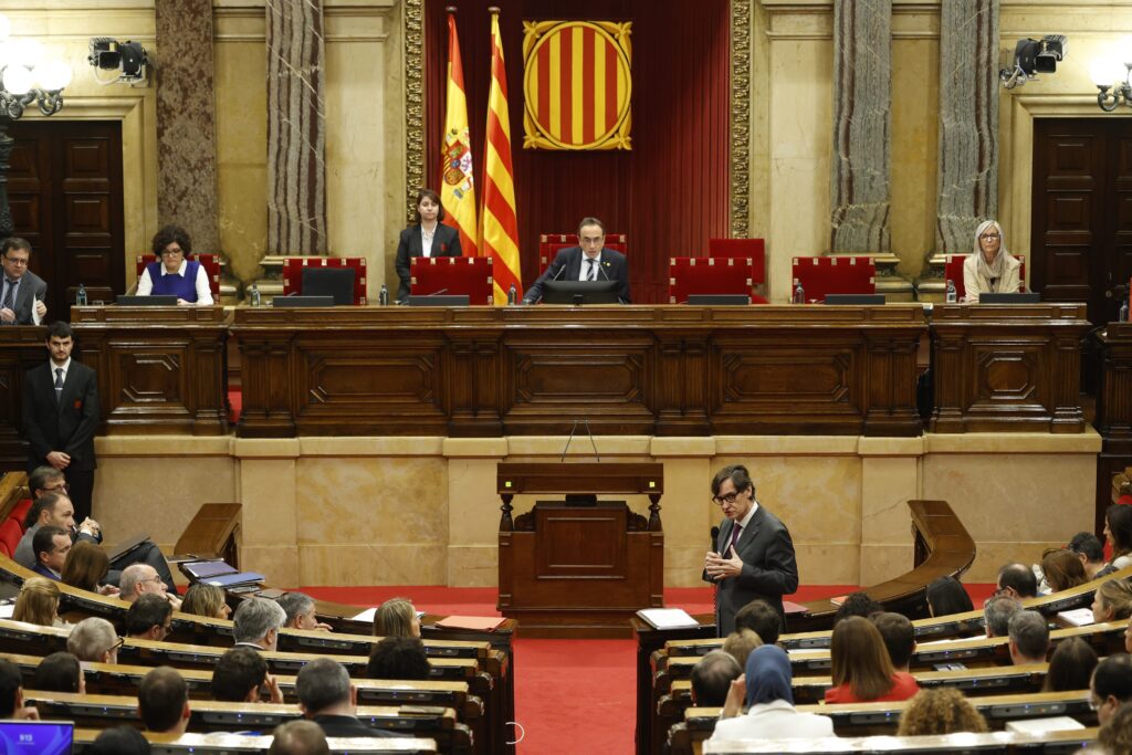 El president de la Generalitat, Salvador Illa, durante una sesión de control al presidente de la Generalitat de Cataluña, en el Parlament de Cataluña, a 13 de noviembre de 2024, en Barcelona, Cataluña (España). En el pleno de hoy se abordan el tempora