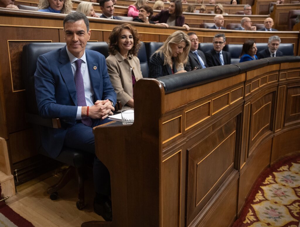 (-D) El presidente del Gobierno, Pedro Sánchez; la vicepresidenta primera y ministra de Hacienda, María Jesús Montero y la vicepresidenta segunda y ministra de Trabajo, Yolanda Díaz, durante una sesión plenaria, en el Congreso de los Diputados, a 27 d