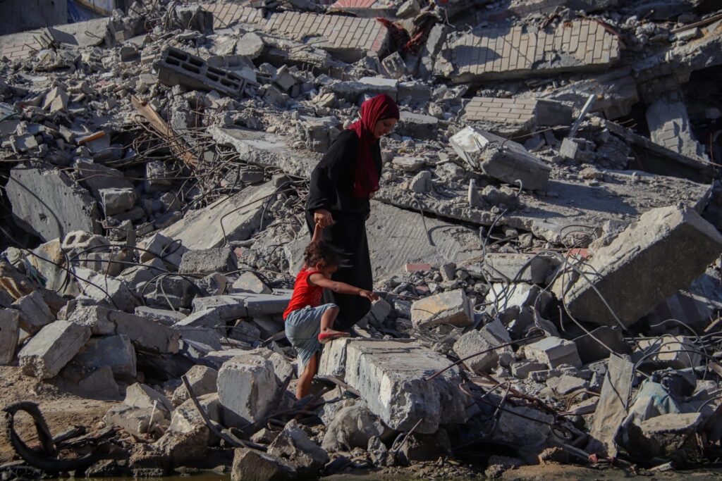 Archivo – Una mujer sobre una zona bombardeada en Jan Yunis, Franja de Gaza