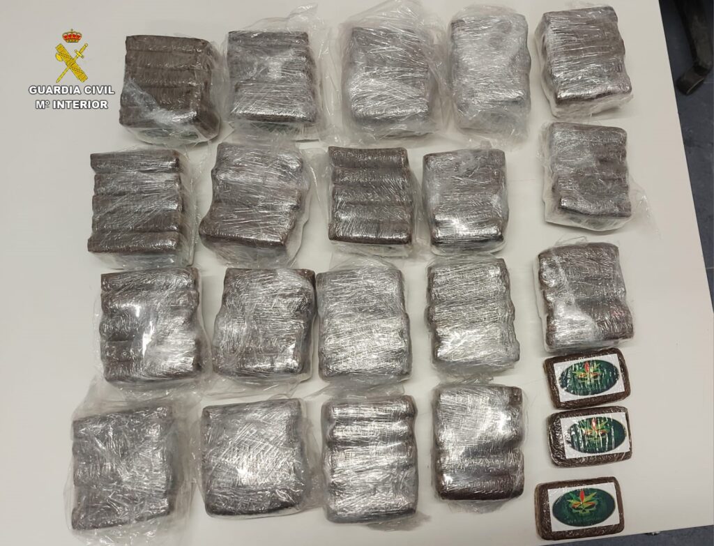 Como resultado de esta identificación, la Guardia Civil localizaba en la parte delantera del interior del vehículo, a los pies del asiento del copiloto, una bolsa que contenía 98 tabletas de una sustancia resinosa y compacta de origen vegetal, que pudiera tratarse de hachís.