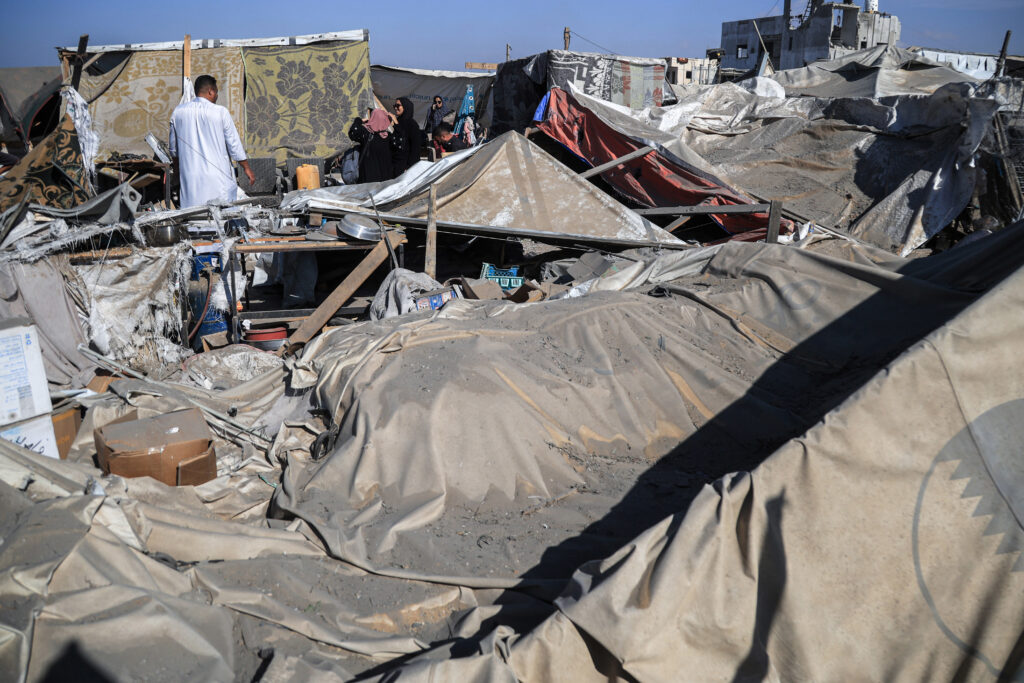 November 12, 2024, Gaza, Gaza, Palestine: Palestinians inspect their tents after Israeli shelling caused extensive damage inside a camp housing displaced people in Khan Younis camp in the southern Gaza Strip, on 13 November, 2024.