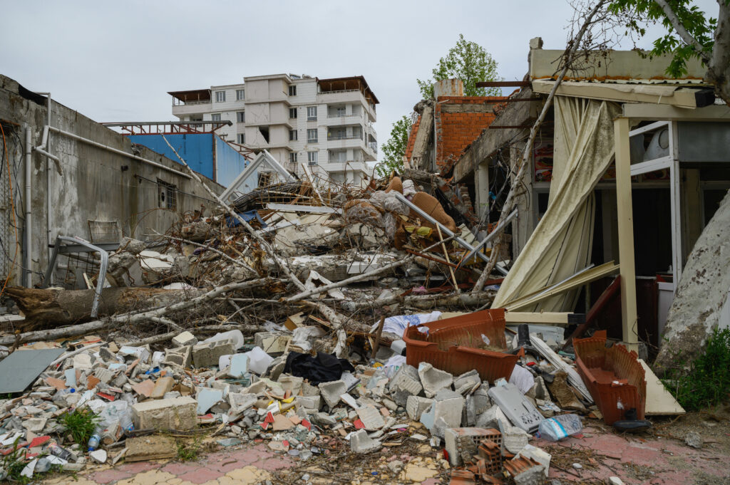 Archivo – Vista de un edificio destruido en Nurdagi, en el sur de Turquía, por el terremoto de 2023