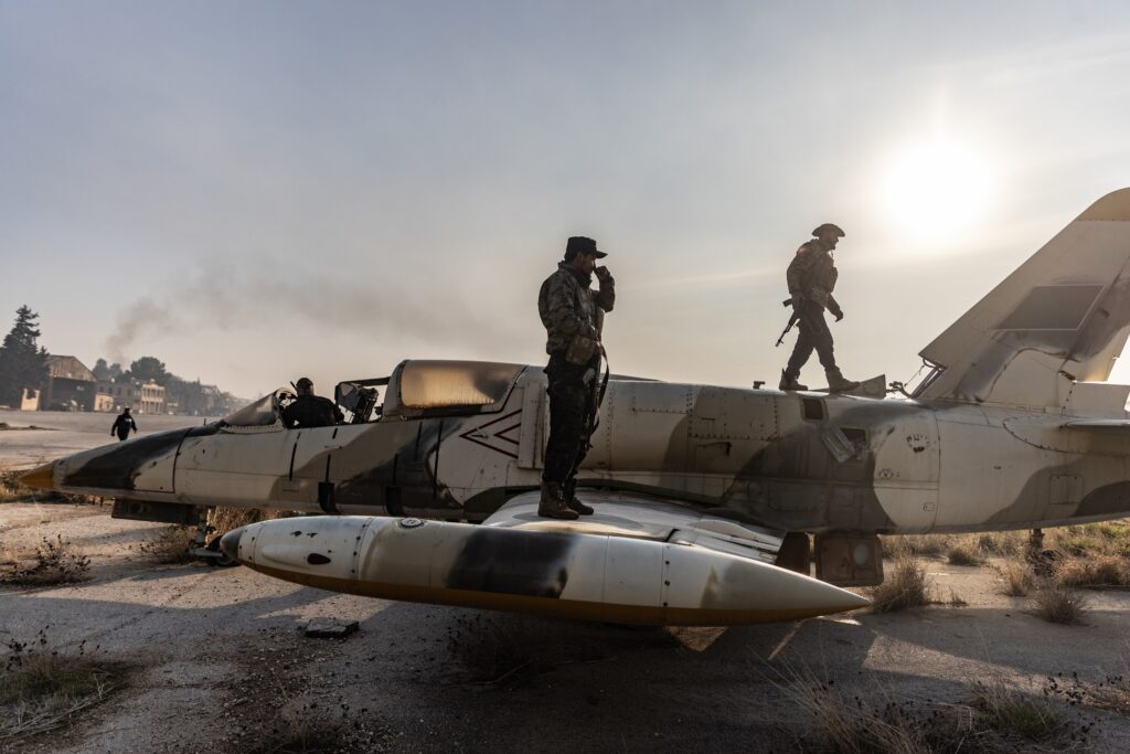 02 December 2024, Syria, Aleppo: Members of the Syrian armed opposition on top of a military aircraft after gaining control of the Nayrab military airport in the city of Aleppo. Photo: Anas Alkharboutli/dpa