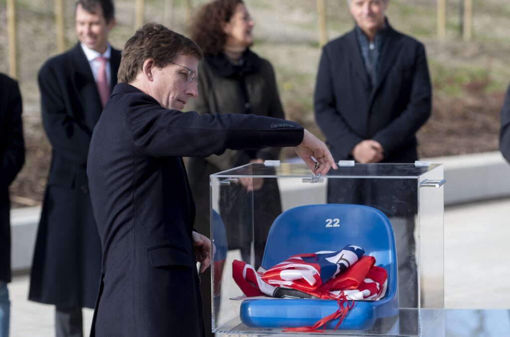 Durante la visita, el alcalde ha rendido homenaje al antiguo Vicente Calderón en el nuevo parque del Atlético de Madrid, ubicado en el mismo espacio que ocupaba el terreno de juego. Acompañado del presidente del club, Enrique Cerezo, Almeida ha introducido una cápsula del tiempo en el punto en el que se situaba el centro del campo.