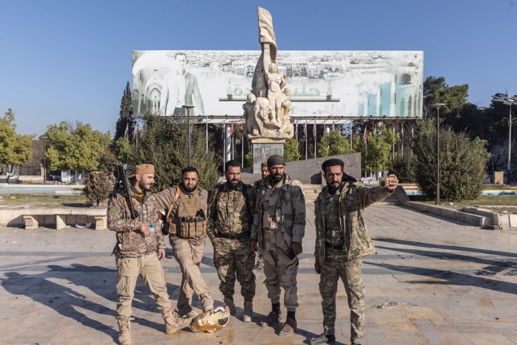 Miembros de grupos armados insurgentes posan tras el derribo de una estatua del expresidente Hafez al Assad en la ciudad de Alepo, Siria (archivo)