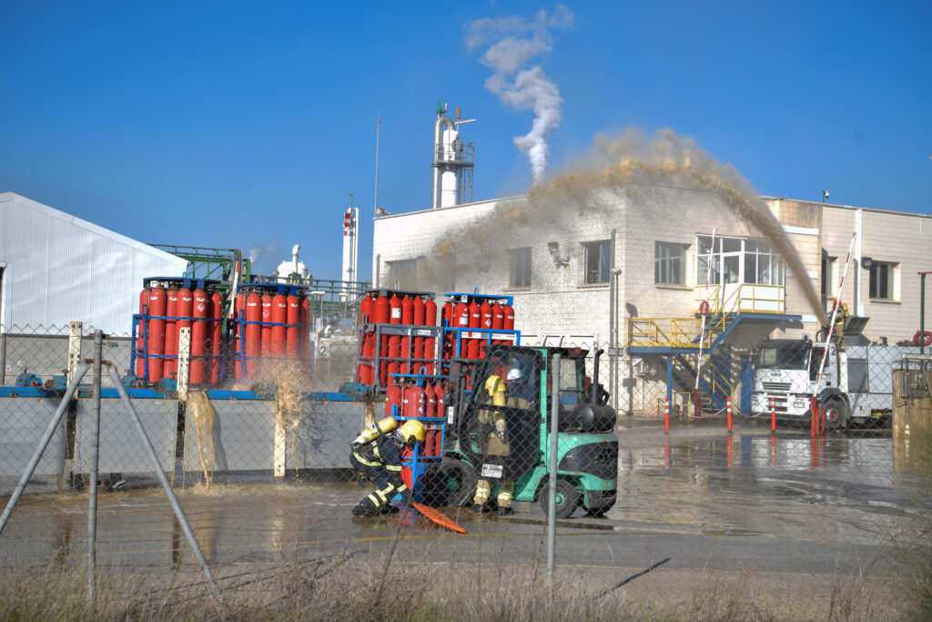 Según ha explicado Alberto Aliaga, responsable de las instalaciones de Air Liquid, el ejercicio ha consistido en el simulacro de un incidente por fuga de gas tóxico inflamable tras el choque de un bloque de hidrógeno durante una maniobra de descarga en un camión. Así, en este supuesto, el golpe de uno de los bloques provoca un dardo de fuego por rotura de uno de los grifos que se expande a los bloques colindantes. En este primer escenario se han simulado dos primeros heridos por quemaduras, aunque el episodio se ha agravado hasta el requerimiento de los bomberos del servicio de emergencias del propio complejo, dos de ellos afectados a su vez por otra explosión.