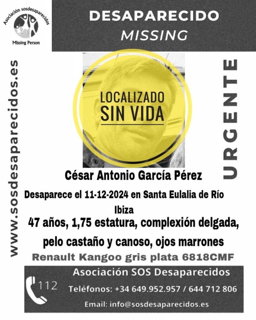 El cuerpo del hombre de 47 años de edad que fue visto por última vez este miércoles, día 11 de diciembre, en la localidad de Santa Eulària des Riu, en Ibiza, ha sido finalmente encontrado sin vida.