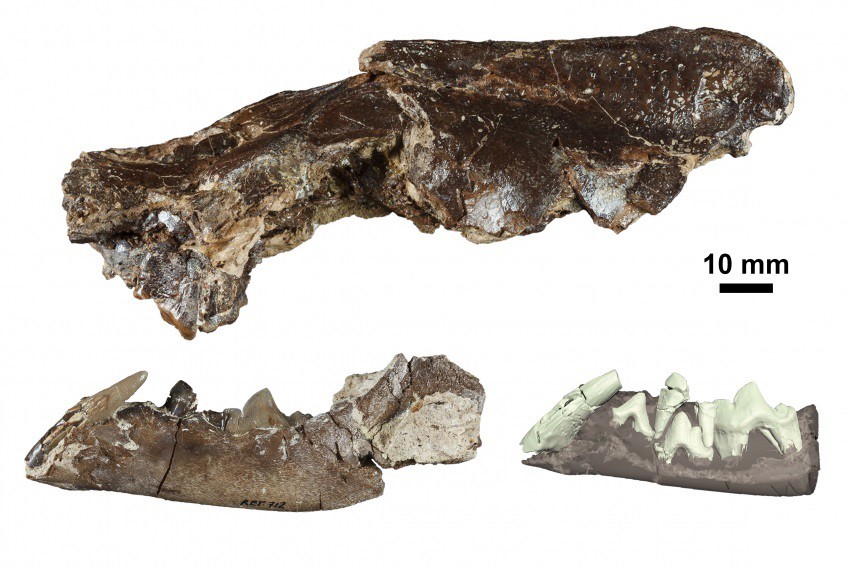 Ischyrictis zibethoides de La Retama, cráneo y mandíbula (izquierda) y reconstrucción 3D de la dentición de la mandíbula (derecha).