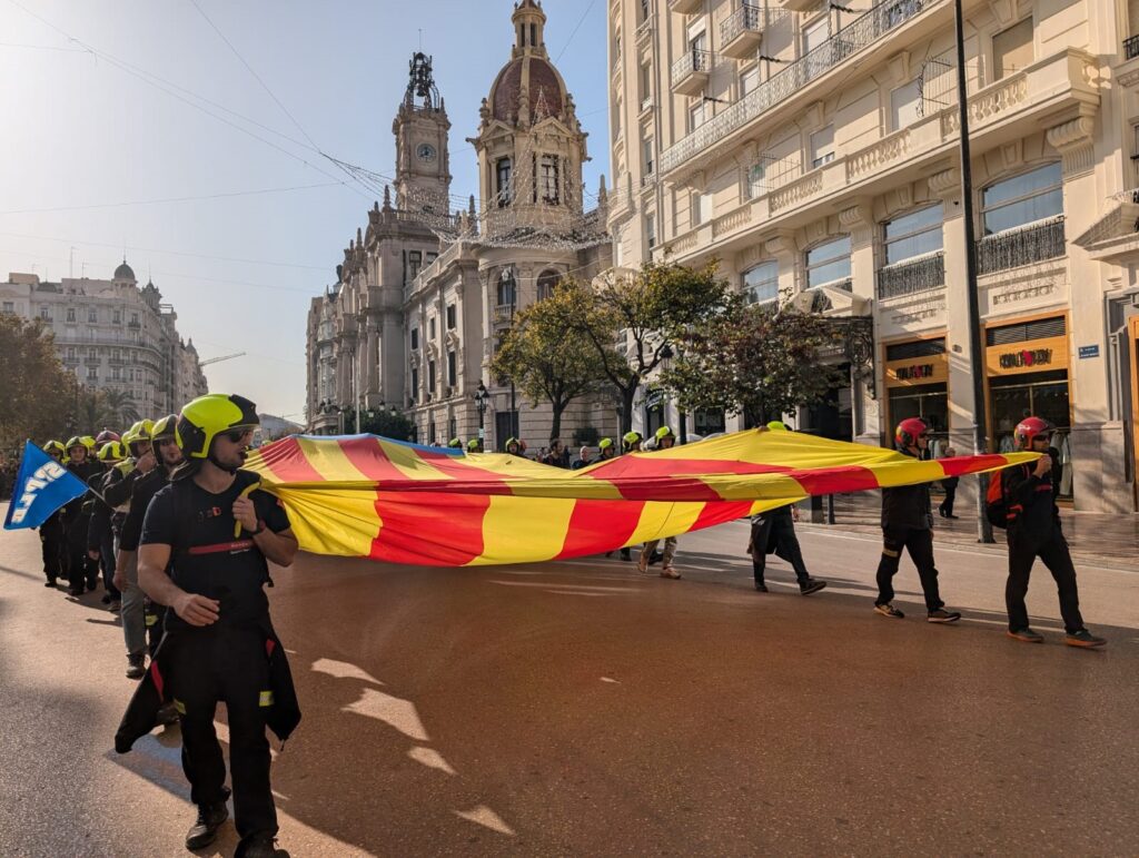 Bomberos de los seis cuerpos de la Comunitat Valenciana han recorrido las calles del centro de València para denunciar la «falta de planificación», «descoordinación» operativa y política e «incompetencia» en la respuesta a la dana por parte de la Generalitat, el Ayuntamiento de València y la Diputación, así como para reclamar la unificación del servicio.