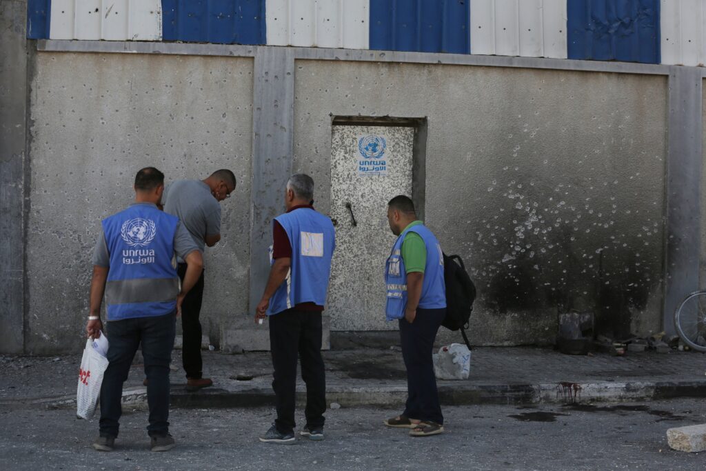 Archivo – Trabajadores de la Agencia de Naciones Unidas para los Refugiados de Palestina en Oriente Próximo (UNRWA) frente a un almacén del organismo atacado por Israel en el campamento de refugiados de Maghazi, situado en la Franja de Gaza (archivo)