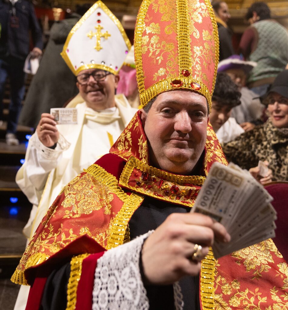 Un hombre disfrazado de obispo con sus décimos antes de comenzar la celebración del Sorteo Extraordinario de la Lotería de Navidad 2024, en el Teatro Real, a 22 de diciembre de 2024, en Madrid (España). El Estado reparte hoy un total de 2.702 millones
