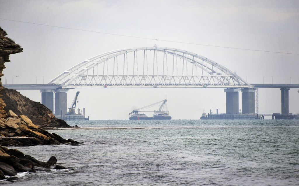 Archivo – Buque mercante pasando bajo el puente del estrecho de Kerch (archivo)