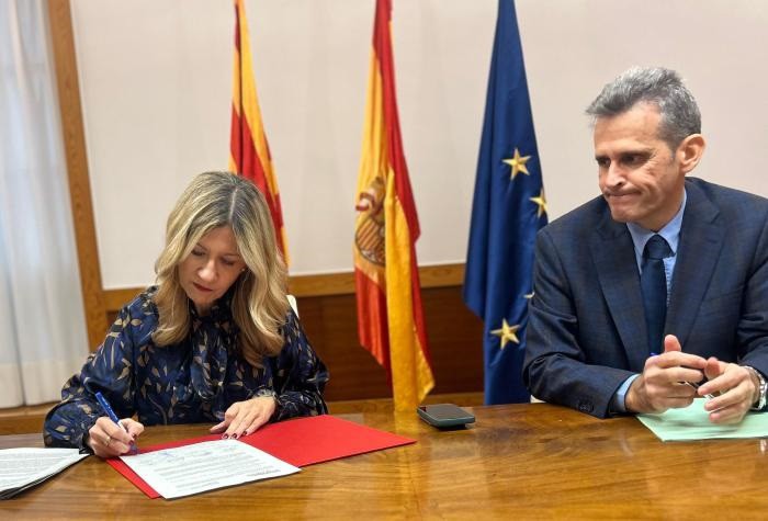 La vicepresidenta del Gobierno de Aragón, Mar Vaquero, este lunes durante la firma con los sindicatos de la Justicia de la subida del complemento autonómico de los más de 1.200 trabajadores de Justicia.