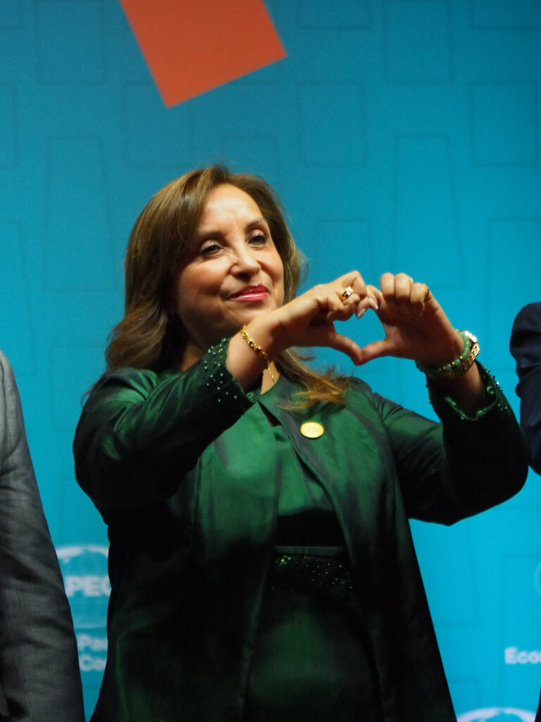 Archivo – November 16, 2024, Lima, Lima, Peru: Dina Boluarte, President of Peru, making a hand heart using her hands when giving the closing speech at the APEC Peru 2024 Economic Leaders Week (AELW).