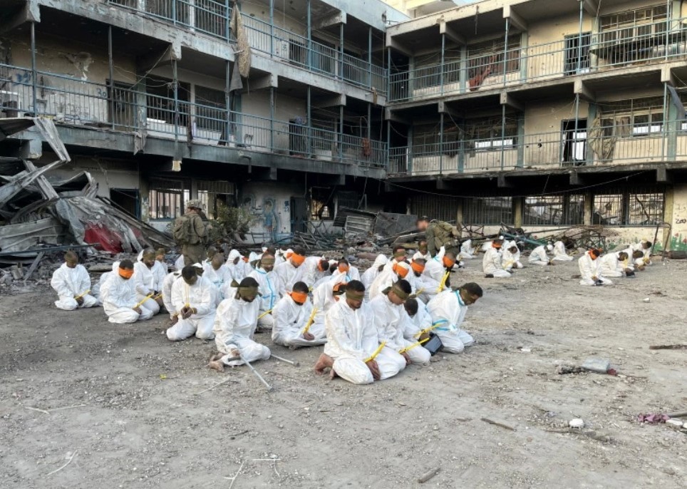 Palestinos detenidos durante el asalto israelí al Hospital Kamal Aduan, en el norte de la Franja de Gaza