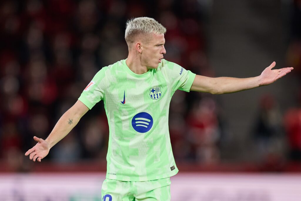 Dani Olmo of FC Barcelona reacts during the LaLiga EA Sports match between RCD Mallorca and FC Barcelona at Son Moix on December 3, 2024, in Palma, Spain.