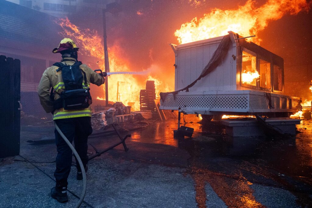 Un bombero trabaja para extinguir las llamas en Pacific Palisades, California