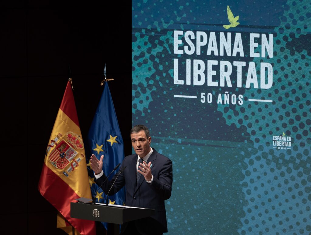 El presidente del Gobierno, Pedro Sánchez, interviene durante el acto ‘España en Libertad’, en el Auditorio del Museo Nacional Centro de Arte Reina Sofía, a 8 de enero de 2025, en Madrid (España)