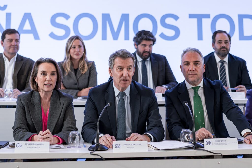 (I-D) La secretaria general del PP, Cuca Gamarra; el presidente del PP, Alberto Núñez Feijóo y el vicesecretario de Coordinación Autonómica y Local del PP, Elías Bendodo, durante una reunión del Comité Ejecutivo de su partido, en el hotel Hyatt Reg