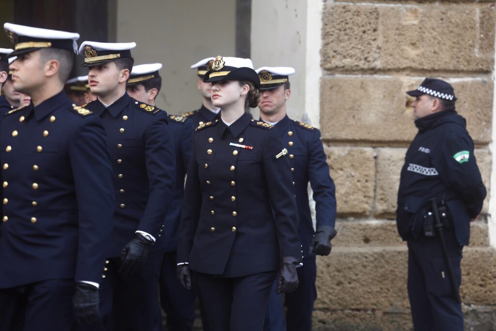 La Princesa Leonor, junto al resto de guardiamarinas del buque escuela ‘Juan Sebastián Elcano’, llegando al Ayuntamiento de Cádiz para una recepción oficial antes de zarpar este sábado.