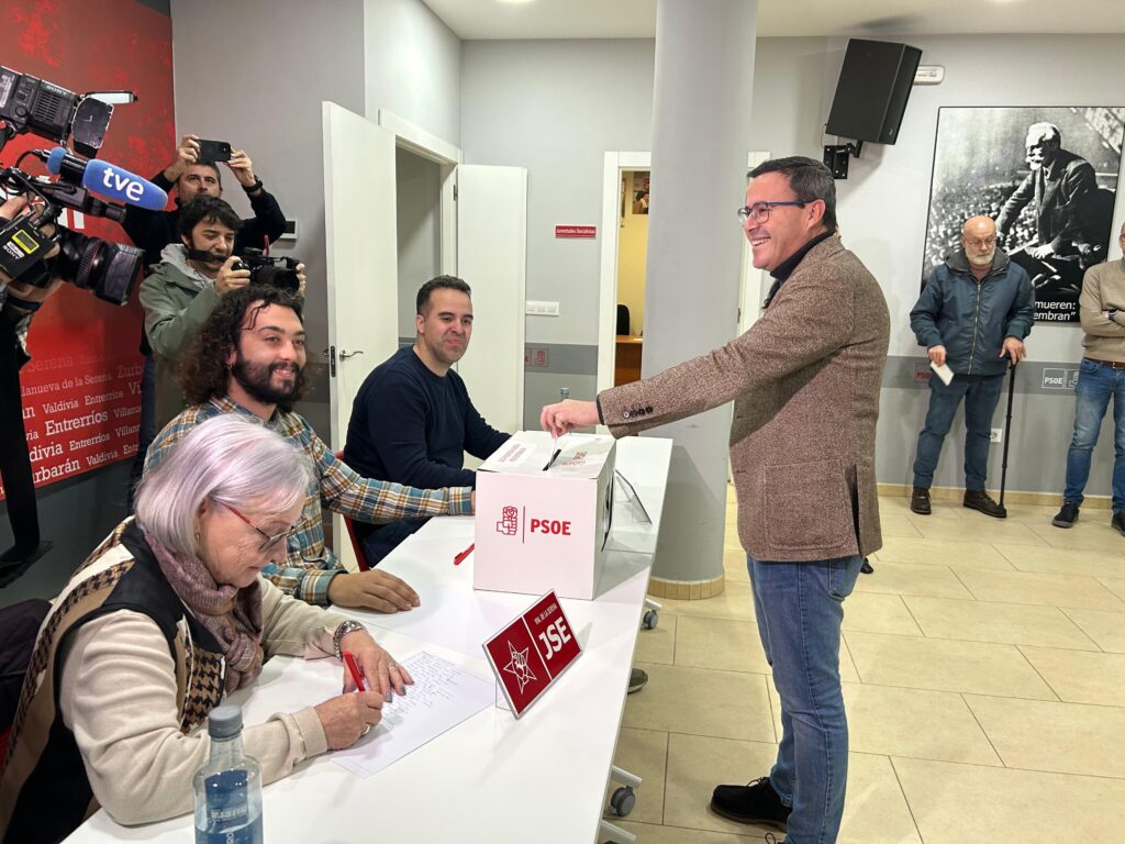 El candidato a la Secretaría General del PSOE de Extremadura Miguel Ángel Gallardo vota en las primarias del partido, en la sede del PSOE de Villanueva de la Serena