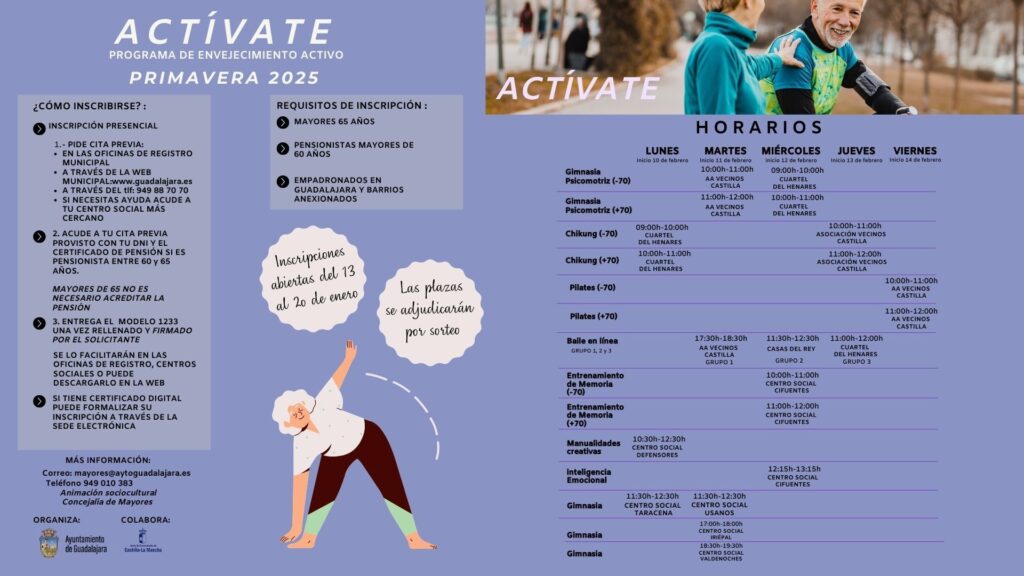 La concejalía de Mayores del Ayuntamiento de Guadalajara abre el plazo de inscripción para las actividades del programa de envejecimiento activo, ‘Actívate’, desde este lunes, 13 de enero, hasta el 20 de enero.