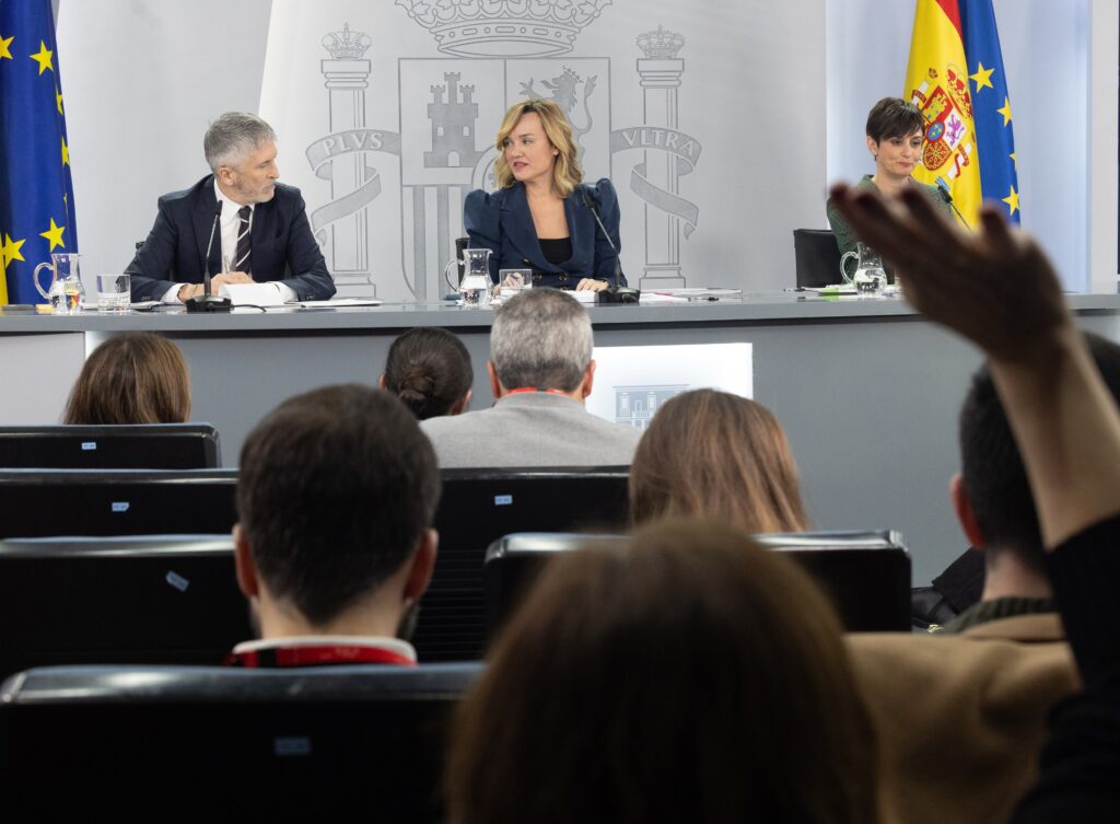 (I-D) El ministro del Interior, Fernando Grande Marlaska; la ministra de Educación, Formación Profesional y Deportes y Pportavoz del Gobierno, Pilar Alegría, y la ministra de Vivienda y Agenda Urbana, Isabel Rodríguez, durante una rueda de prensa poste