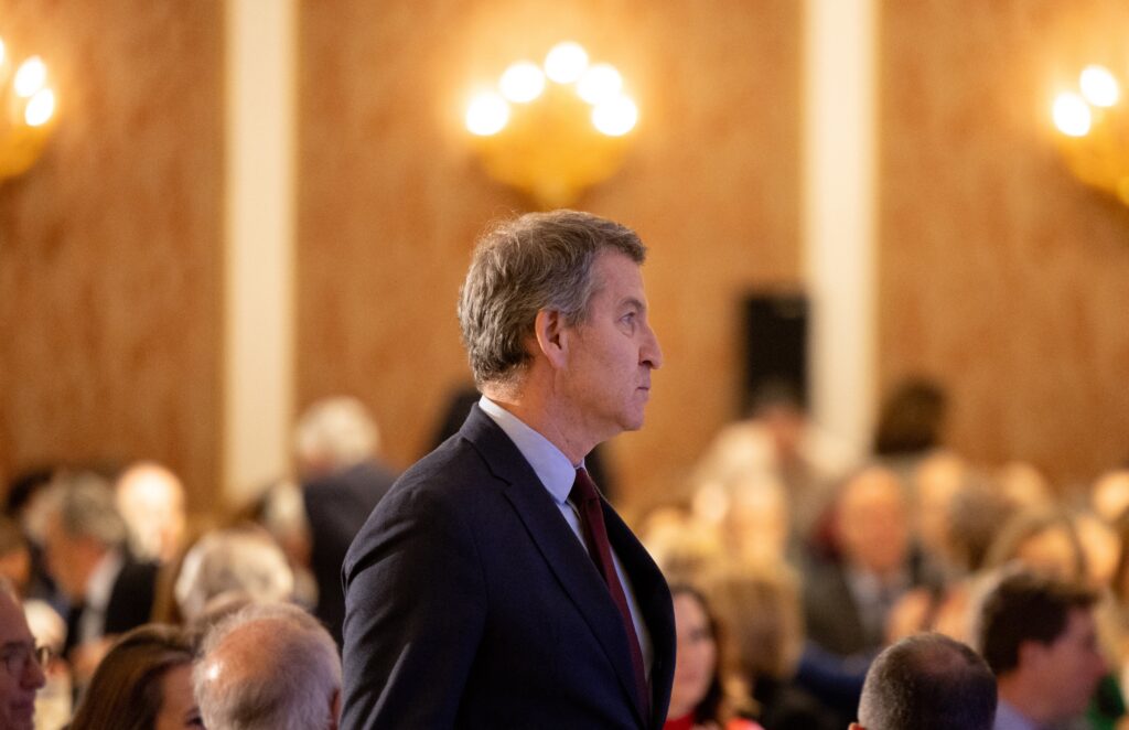 El presidente del Partido Popular, Alberto Núñez Feijóo, llega a un desayuno informativo de Fórum Europa, en el Hotel Four Seasons, a 14 de enero de 2025, en Madrid (España).
