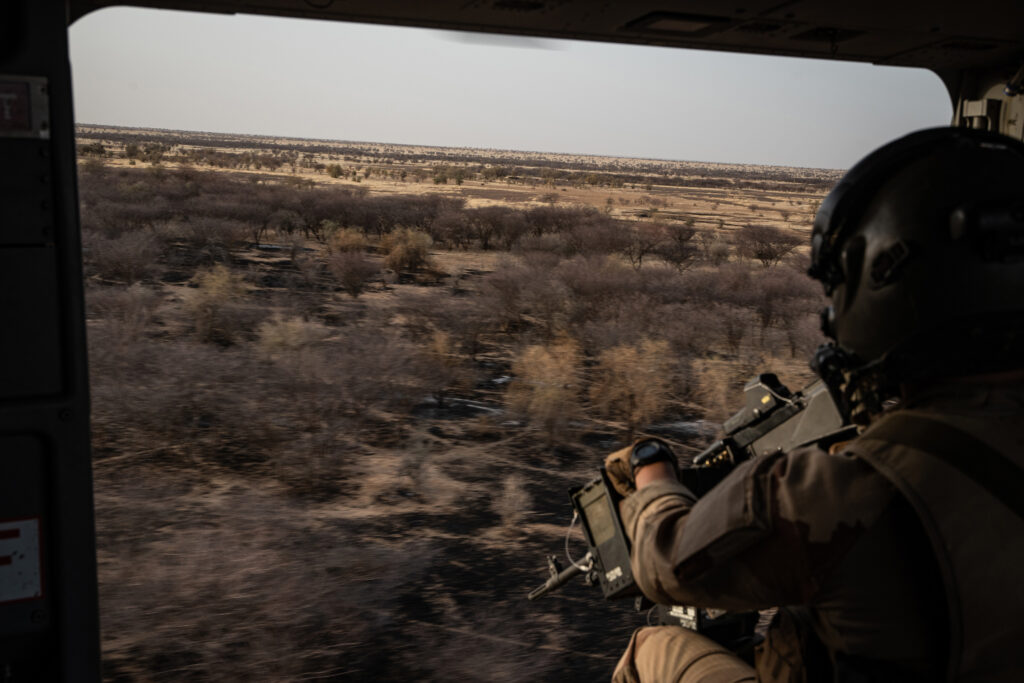 Archivo – Vista de un soldado a bordo de un helicóptero sobre la ciudad de Gao en Malí (archivo)
