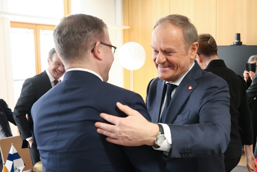 El primer ministro de Polonia, Donald Tusk, saluda a su homólogo finlandés, Petreri Orpo.