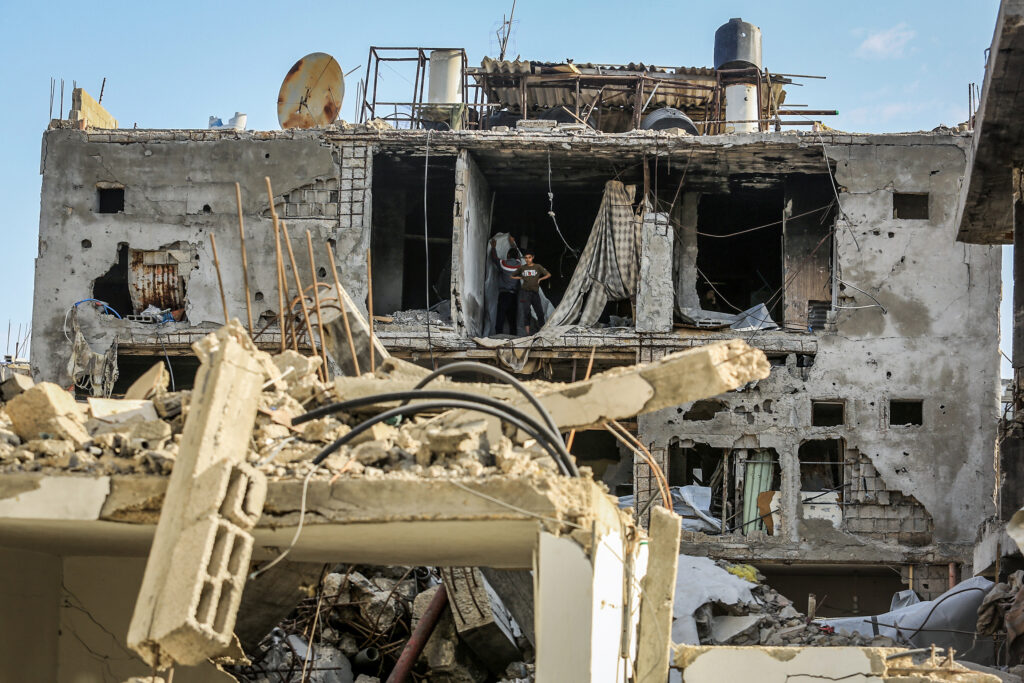 Palestinos en un edificio destruido en Jan Yunis a causa de los bombardeos del Ejército de Israel contra la Franja de Gaza