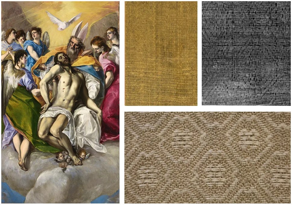 La Trinidad de El Greco. Detalles del lienzo de reentelado y del tejido original.