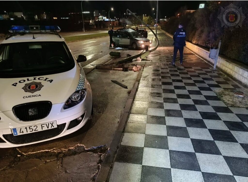 Un conductor ha colisionado contra un semáforo en la calle Pilar Navarro de Cuenca cuando trataba de huir de las Fuerzas y los Cuerpos de Seguridad del Estado, según ha informado la Policía Local de Cuenca a través de la cuenta de Instagram donde dan a conocer su trabajo.