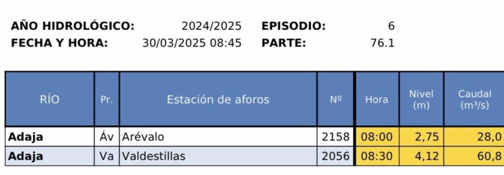 En concreto, el Adaja en Arévalo se encuentra en tendencia descendente con un caudal de 27,99 metros cúbicos por segundo (m3/s) y un nivel de 2,75 metros, mientras en Valdestillas la tendencia también es a la baja, con un caudal de 60,21 (m3/s) y un nivel 4,10 metros, de acuerdo a los datos del organismo de cuenca.