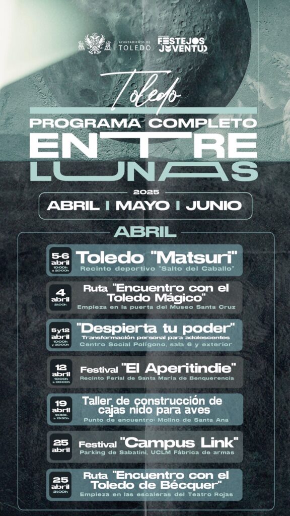 El Ayuntamiento de Toledo, a través de la Concejalía de Juventud, ha lanzado el programa ‘Entre Lunas’ para los meses de abril, mayo y junio, que incluye un ciclo de 16 actividades dirigido a jóvenes de entre 14 y 35 años, y una variada programación cultural, deportiva y de ocio alternativo con el objetivo de fomentar la participación de los jóvenes toledanos.
